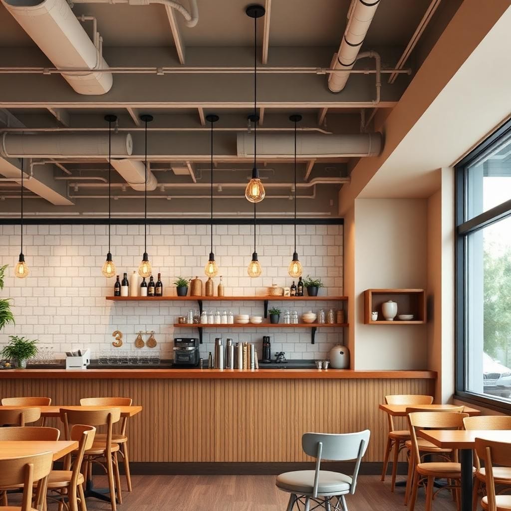 • Quán café theo phong cách Industrial sử dụng đèn spotlight và đèn thả sắt.