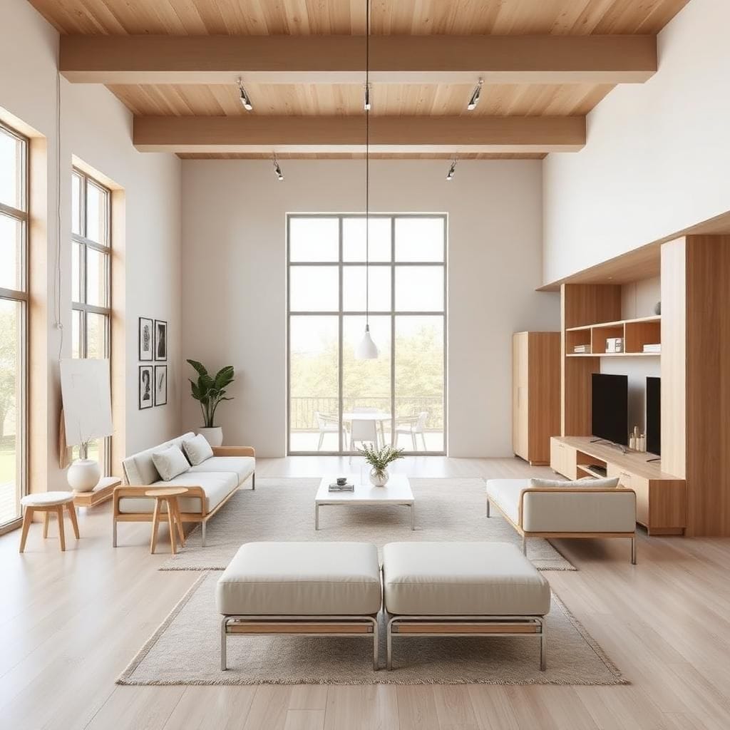 Đặc trưng: Gam sáng (trắng, be, xám nhạt), gỗ tự nhiên, ánh sáng ngập tràn.