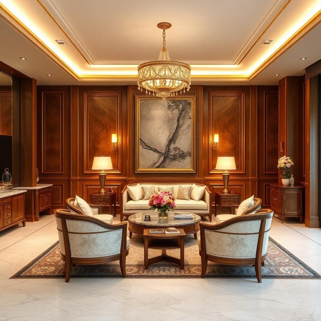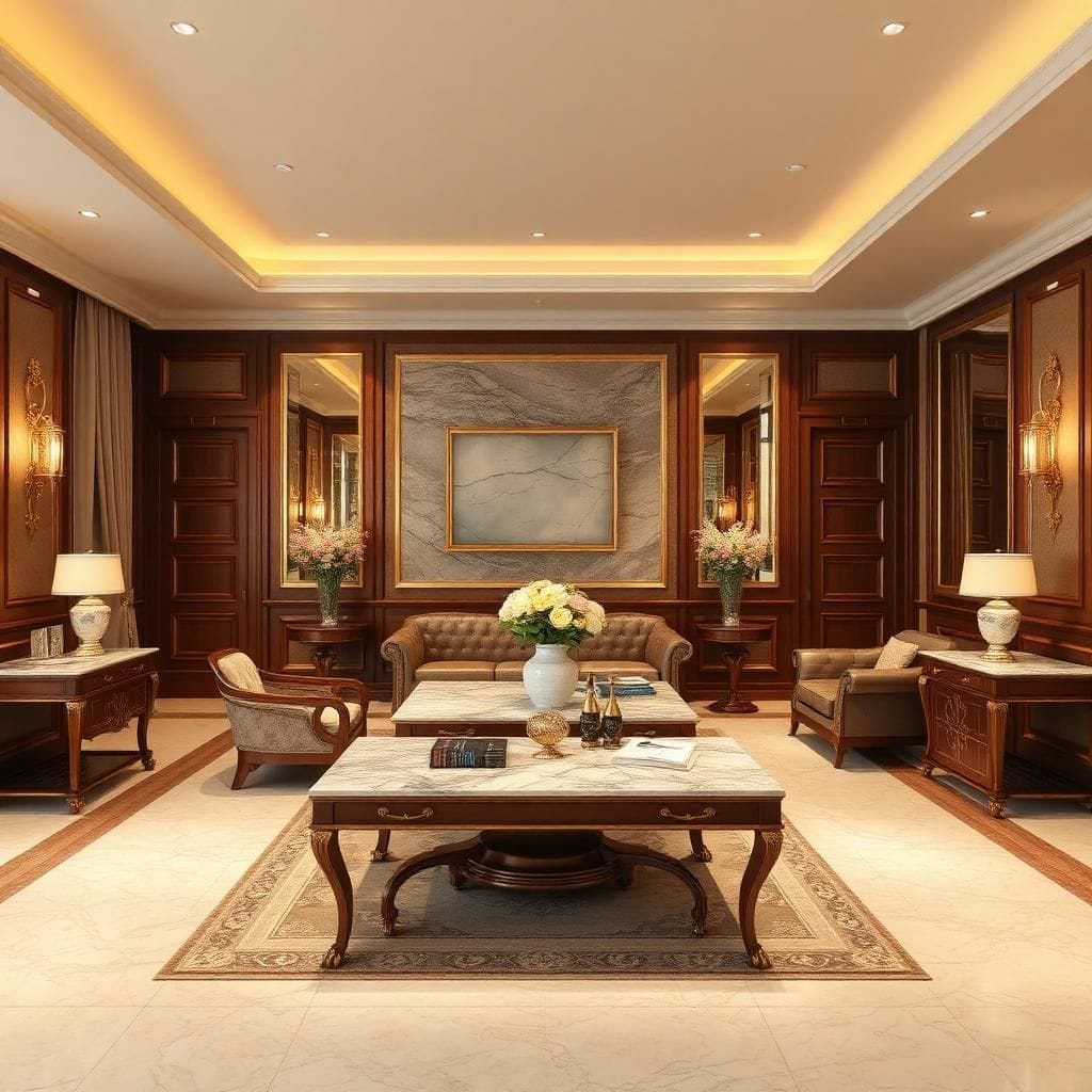Tân cổ điển: Gỗ tự nhiên, đá marble, da thật.