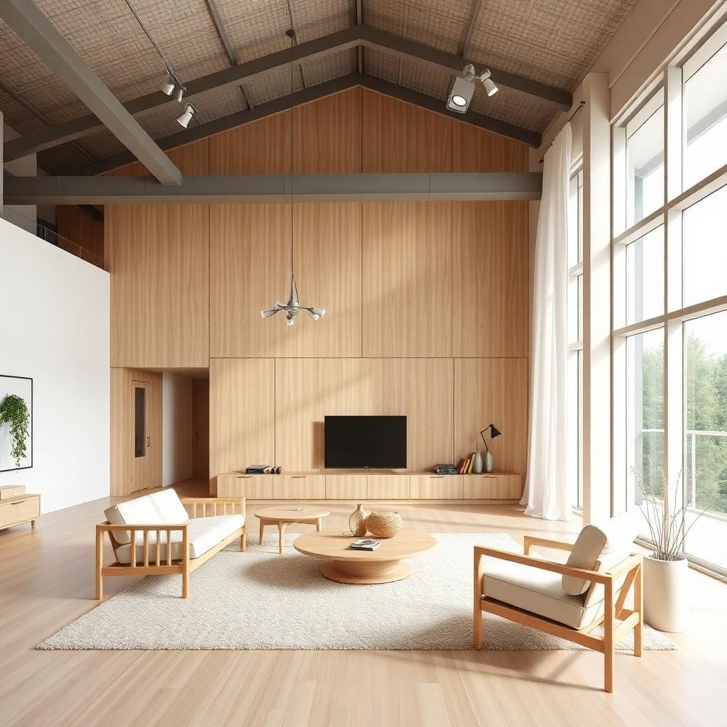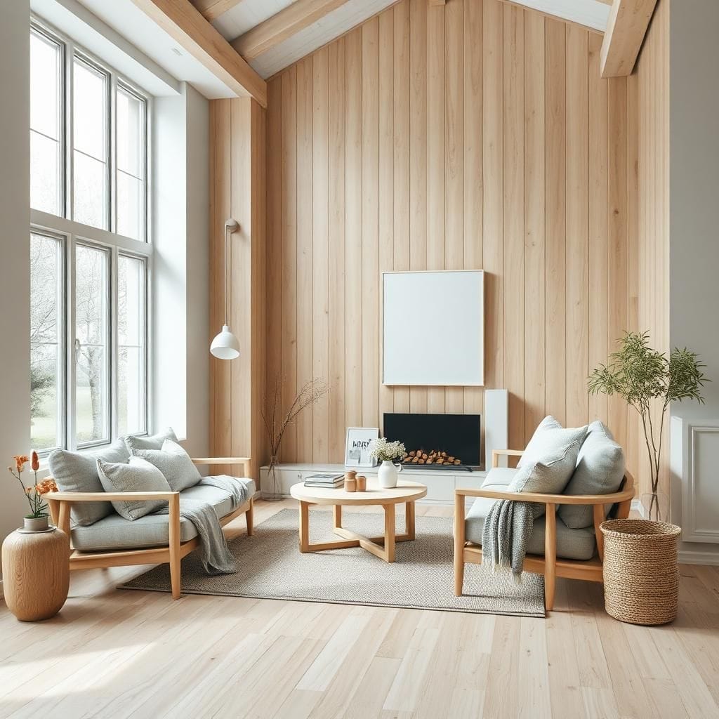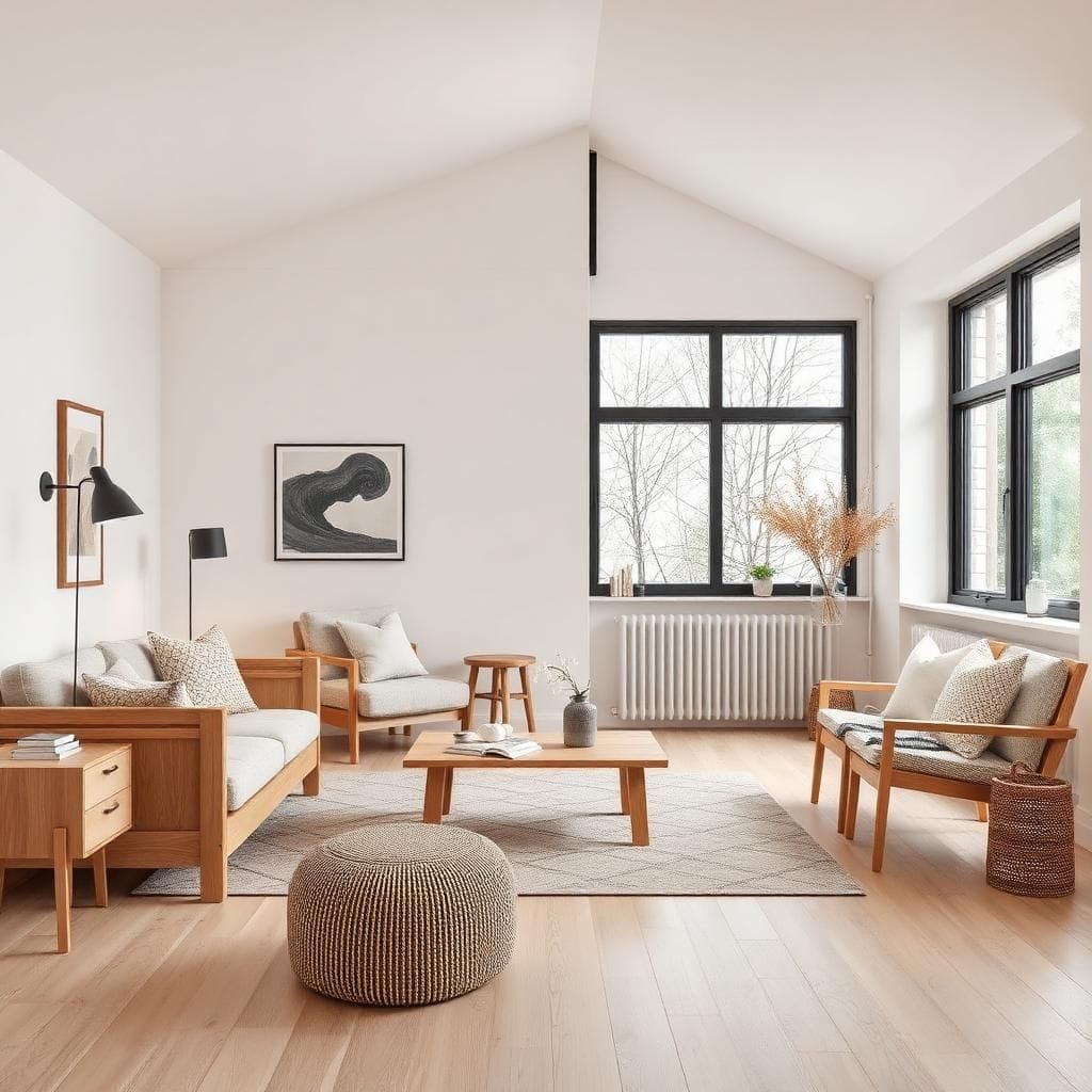 Scandinavian: Gỗ tự nhiên sáng màu, vải, da.