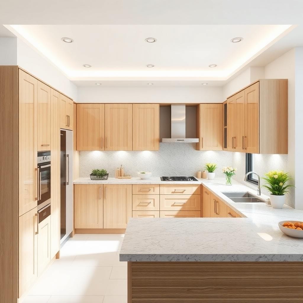 Tủ bếp: MDF chống ẩm phủ Laminate, Acrylic hoặc gỗ tự nhiên.
